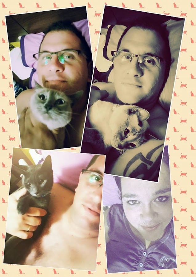 Un día antes de irnos a dormir... Mi marido, mi gatita Favi, mi gatito Zeus y yo ^_^