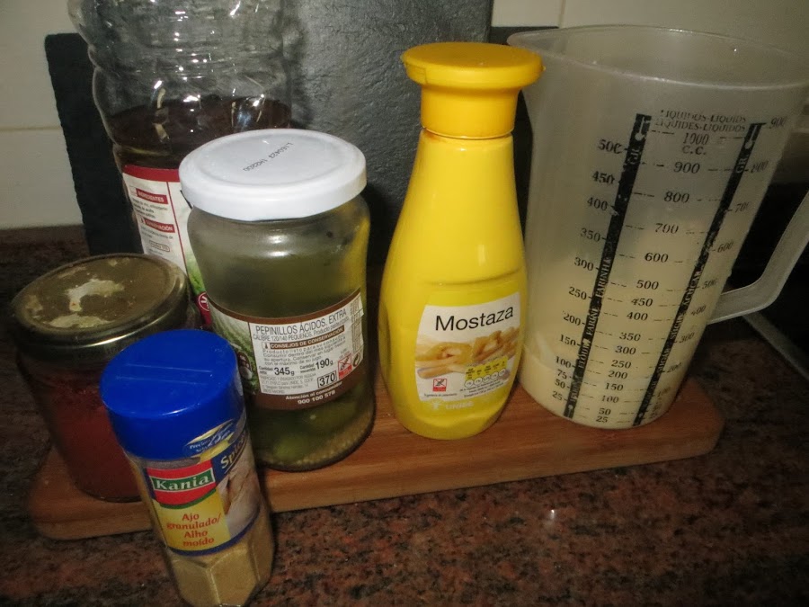 Lo primero que hacemos es la salsa, simplemente hay que mezclar todos los ingredientes y pasarlos por la batidora, no os paséis con el pimentón, ya que le puede dar mucho gusto y el toque agrio ya lo ponen los pepinillos y la mostaza.