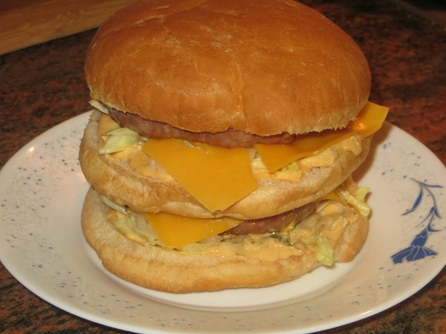 Luego simplemente hay que cocinar las hamburguesas a la plancha con un poco de aceite y comenzamos a montar la hamburguesa, colocamos uno de los panes, que untamos generosamente de salsa, y encima ponemos la lechuga iceberg cortada en tiras y la cebolla en trozos pequeños, la loncha de queso y la carne para que deshaga un poco el queso, otro trozo de pan, más lechuga, cebolla, queso y carne y encima unas rodajas de pepinillo, untamos en la tapa más salsa big mac y lista para comer.