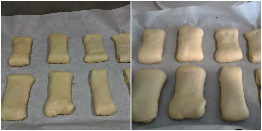 Colocamos los bollitos en una bandeja con papel de horno con los pliegues hacia abajo, tapamos con un paño y lo dejamos levar 1 hora.