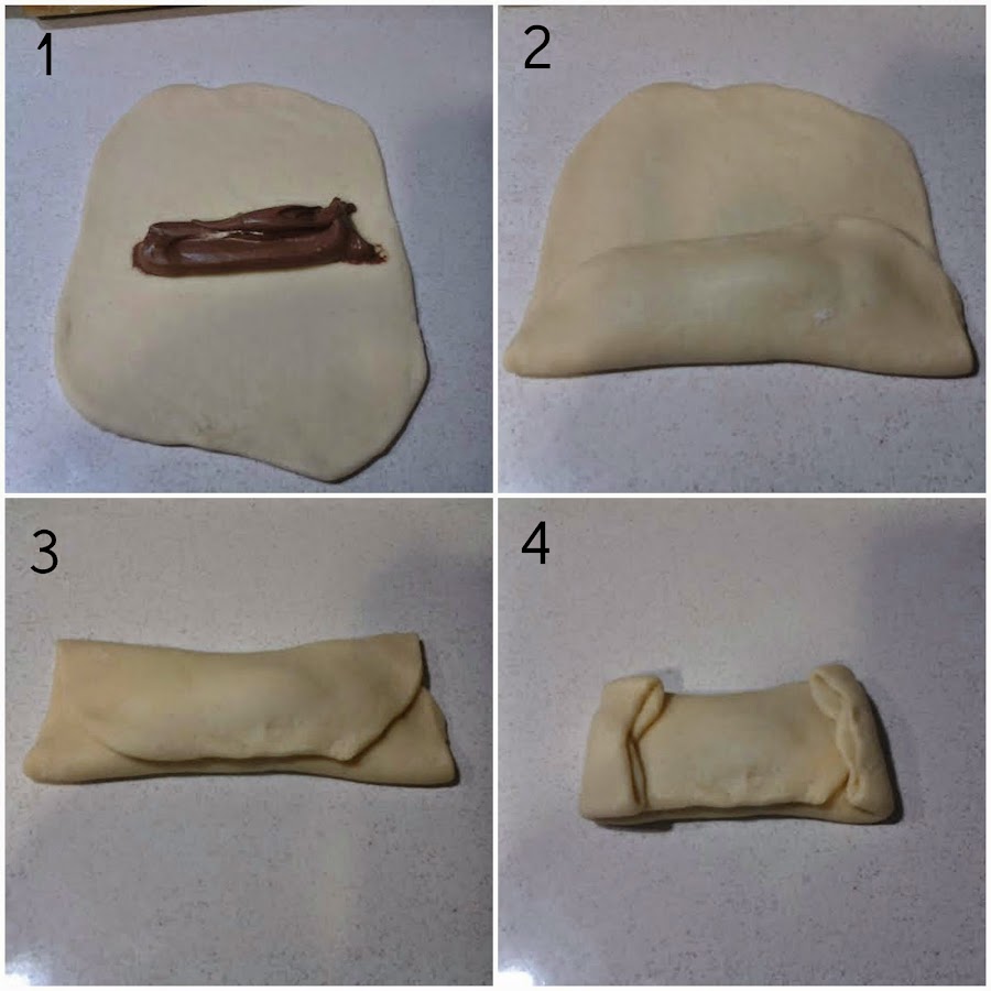 Estiramos hasta formar un rectángulo y colocamos un poco de nutella en el centro. Doblamos la parte de abajo de la masa hasta el centro, luego la superior y por ultimo los laterales de modo que quede bien sellada la nutella y no se salga.