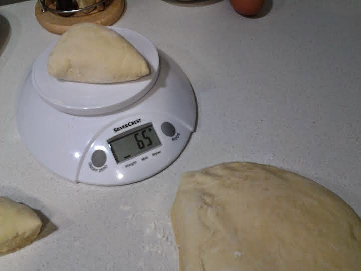 Cuando haya fermentado, dividimos la masa en porciones de unos 65-70 g cada una.