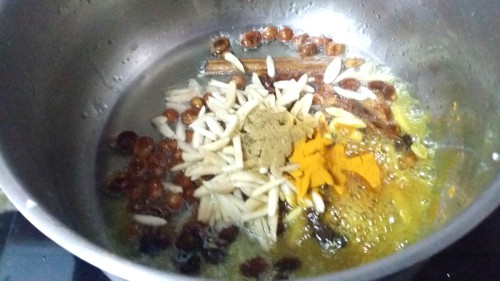 - En una cazuela que tenga una tapa que ajuste bien ponemos el aceite a calentar y en él sofreímos las especias, las pasas y las almendras durante un par de minutos.