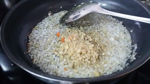 - A continuación añadimos el ajo y el jengibre y salteamos durante un minuto.