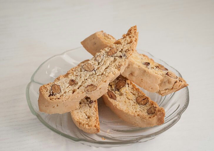 En el tazón de la batidora colocar los huevos batir a espumar,cernir harina,polvo de hornear y sal agregar al batido el azúcar en polvo cernida junto con la vainilla batir agregar lo cernido junto con las almendras y el brandy batir por 1minuto pasar la pasta a la mesa de trabajo con harina rociada rociar harina a la pasta ya que es pegajosa dividir en dos partes dar formar rectangular sobre una bandeja engrasada o con un silpat llevar al horno precalentado a 350grados f por 15minutos pasado el tiempo sacar aún tibios con un cuchillo de sierra cortar los rectángulos de pasta volcar las rebanadas de biscotti sobre la bandeja volver al horno ahora 10minutos,pasado el tiempo voltear las rebanadas de biscotti y hornear otros 10minutos más,pasado el tiempo colocar las rebanadas de biscotti sobre una rejilla y enfriar antes de servir.