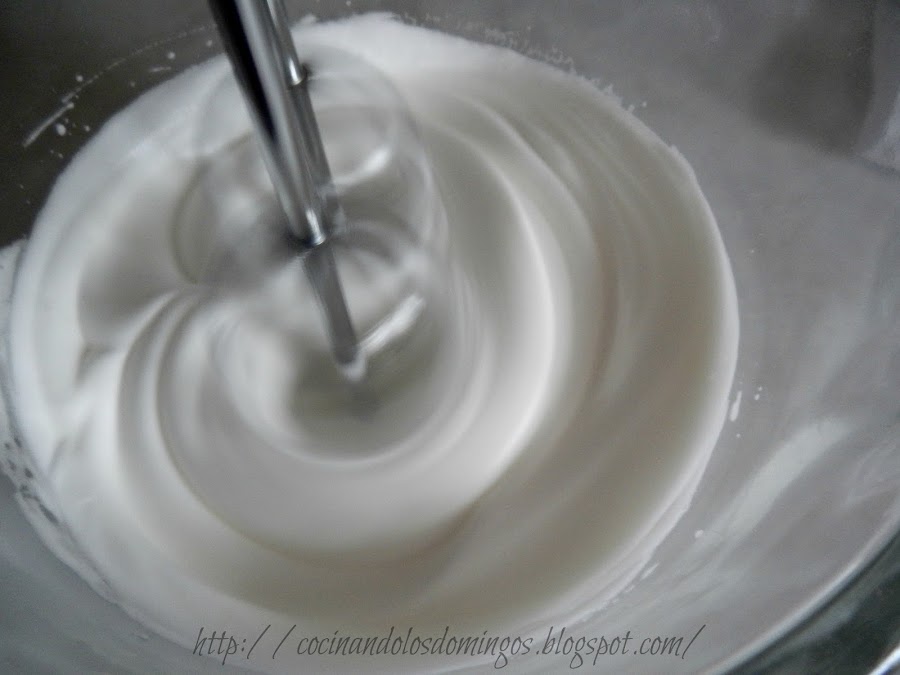 cuando tengan una consistencia como de espuma de afeitar bajamos la velocidad de la batidora y agregamos lentamente el azúcar en forma de lluvia