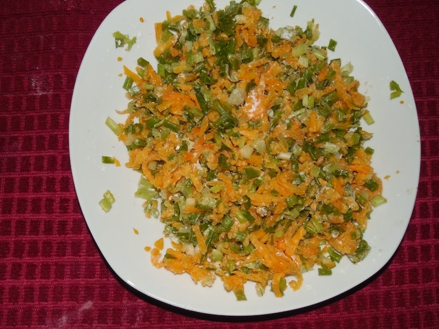 1)_En un plato colocamos el cheddar y ciboulette picado,le agregamos 2 cucharadas de harina,mezclamos y reservamos a un lado.(este paso sirve para que se integren mejor a la masa)