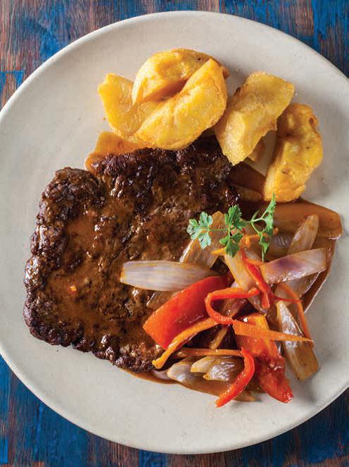 Abrir el lomo por la mitad con un cuchillo y hacer un corte tipo mariposa. Con la ayuda de una bolsa de plástico y un mazo, chancar con cuidado la carne y extenderla hasta formar un bistec o churrasco. Reservar. En una sartén calentar la mitad del aceite vegetal y saltear la cebolla en gajos por 1 minuto. Retirar y reservar. En la misma sartén dorar ligeramente 3/4 cucharadita de ajo picado por 1 minuto a fuego bajo. Luego agregar el ají panca con el ají mirasol y dorar por unos minutos. Añadir el orégano, la hoja de laurel, el vinagre y el caldo de res. Dejar cocer removiendo y después de 10 minutos sazonar con sal y agregar el tomate, el ají amarillo, el ají mochero y el rocoto asados. Regresar la cebolla previamente reservada a la sartén. Condimentar con sal, pimienta y comino. Si fuera necesario, incorporar un poco más de caldo de res para darle jugosidad a la salsa. Sazonar la carne de lomo con sal, pimienta y 1/4 de cucharadita de ajo picado restante. Freír en una sartén grande a fuego alto con el aceite restante. La carne debe quedar cocida a término medio. Luego colocar el bistec en la salsa chorrillana por 1 minuto. Servir y acompañar con las papas doradas. Decorar con la ramita de culantro.