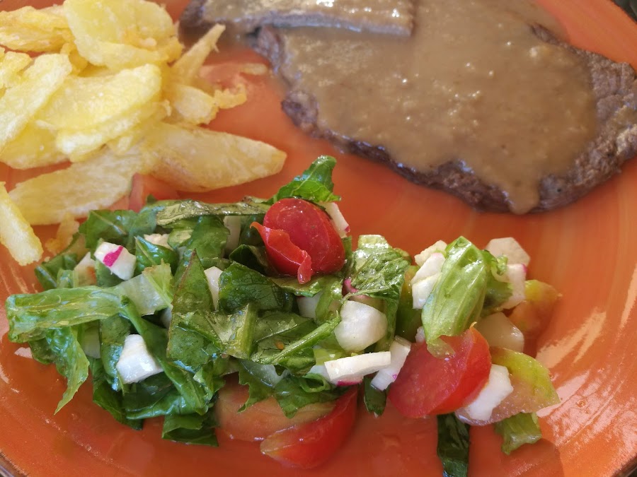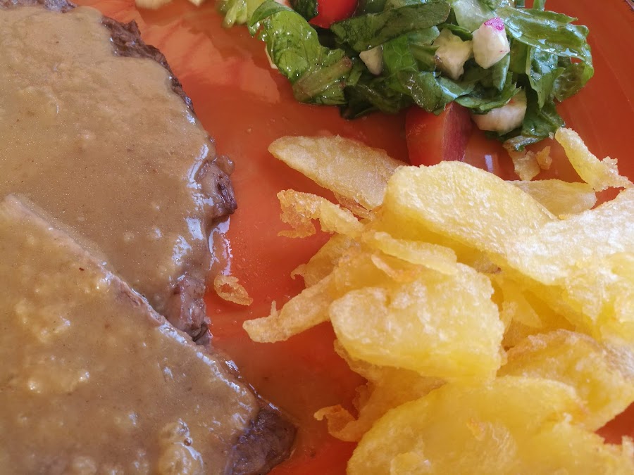 - Servimos los bistecs con la salsa por encima, y si queremos un plato completo, añadiendo ensalada y patatas fritas está de olé!!