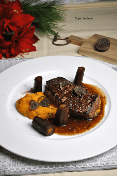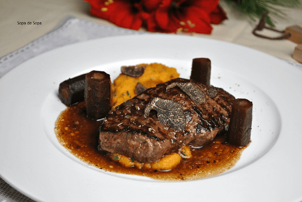 Servir; Poner en los platos el puré, colocar encima el Bistec salseado, poner las zanahorias por el alrededor y terminar con láminas finas de trufa por todo el plato.