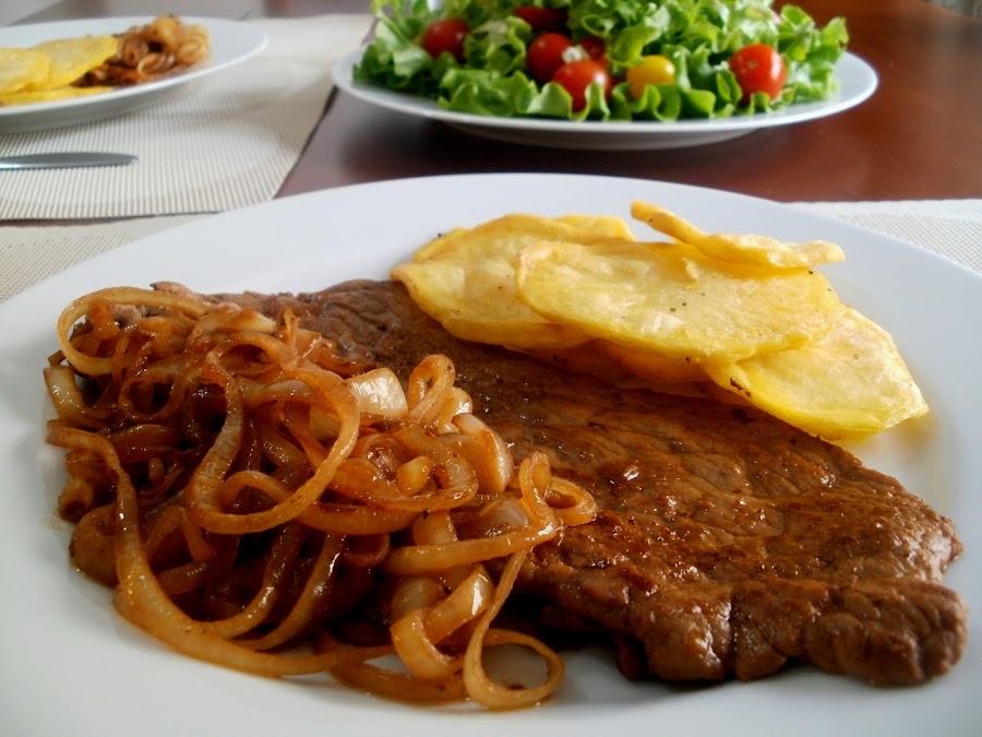 El bistec encebollado es un plato sencillo que se hace con pocos ingredientes y no requiere una preparación muy elaborada. Básicamente la receta consiste en sofreír lentamente unas rodajas de cebolla hasta dorarlas, sellar unos filetes de carne y terminar uniendo estos ingredientes para que liguen sus sabores. El resultado es una delicia!