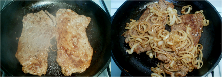 Sacamos los aros de cebolla y reservamos. Subimos el fuego y sellamos o doramos rápidamente los filetes por ambos lados en la misma sartén. Cubrimos la carne con las rodajas de cebolla, bajamos el fuego al mínimo y añadimos seis cucharadas de agua. Removemos, tapamos y cocinamos el bistec por cinco minutos. El agua ayudará a integrar todos los sabores y nos quedará una salsita muy rica. Servimos enseguida.
