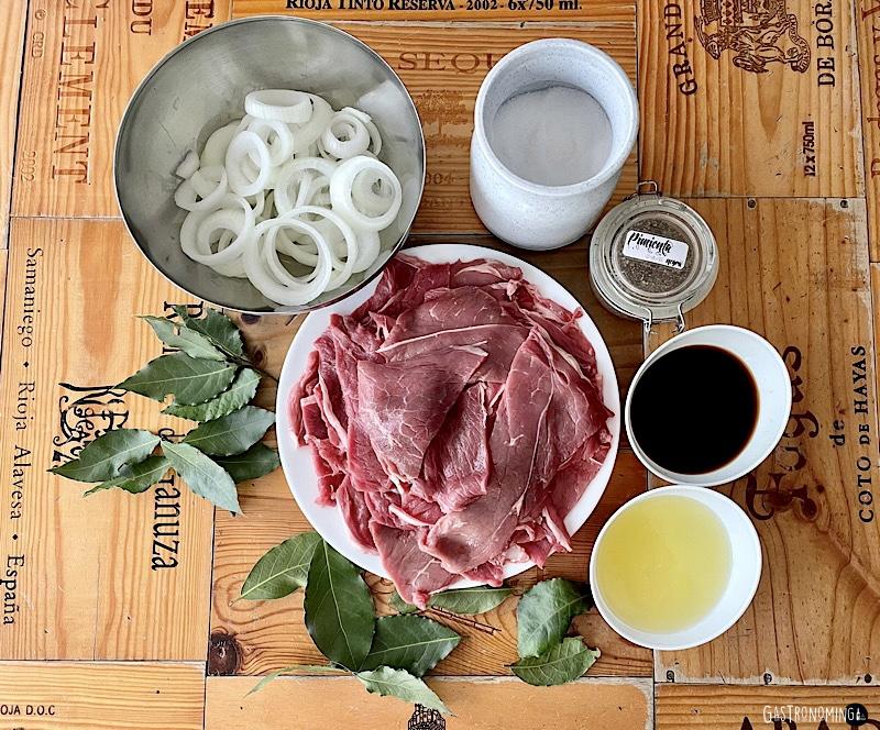 5. Ahora añadimos las cebollas y cubrimos con los líquidos del marinado y sumamos las hojas de laurel.