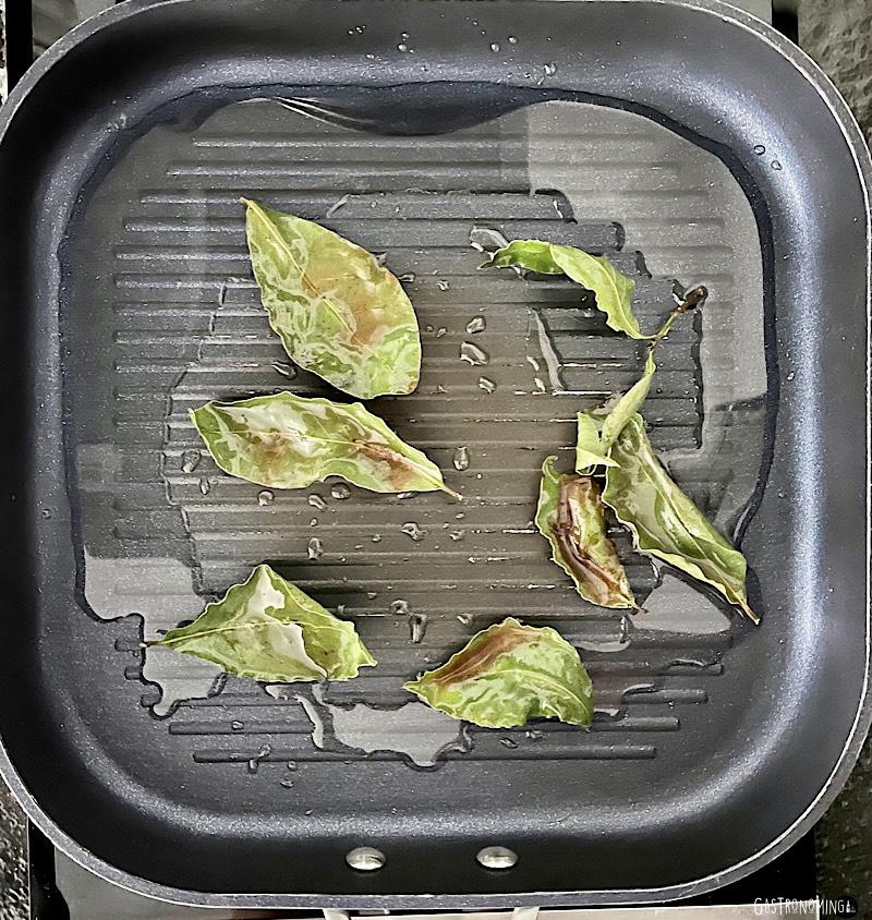 3. En la sartén, ponemos aceite vegetal a fuego medio y doramos las hojas de laurel durante un minuto o hasta que los bordes empiecen a ponerse de color marrón. Retiramos el laurel. Reservar.