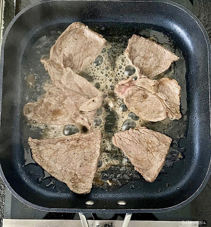 6. Inmediatamente bajamos el fuego a mínimo, agregamos los filetes, tapamos y dejamos cocinar unos 40 minutos hasta que reduzcan los jugos y la carne esté tierna.