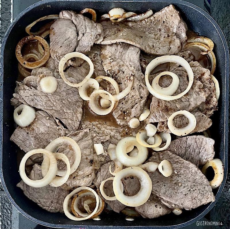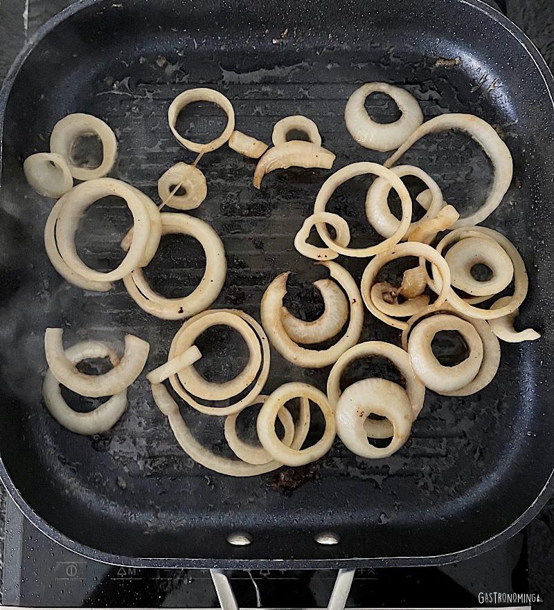 5. Volvemos a la sartén, retiramos los jugos de los filetes y le echamos 1 cucharada de aceite y mantenemos el fuego a medio-alto. Añadimos 2 tercios de las cebollas (reservamos el resto de aros para el final) y cocinamos hasta que estas queden blandas.