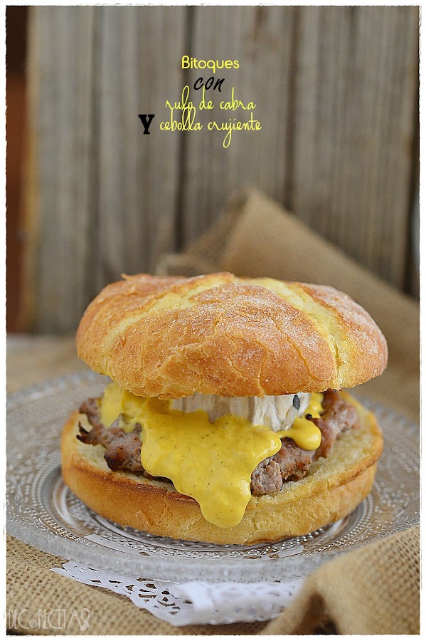 Los bitoques son hamburguesas de carne picada, en este caso también de ternera, y se hacen a la plancha mezclando con ajo y perejil en polvo. Cocinamos a la plancha y haremos lo mismo con los rulos de queso de cabra. Para culminar cebolla frita.