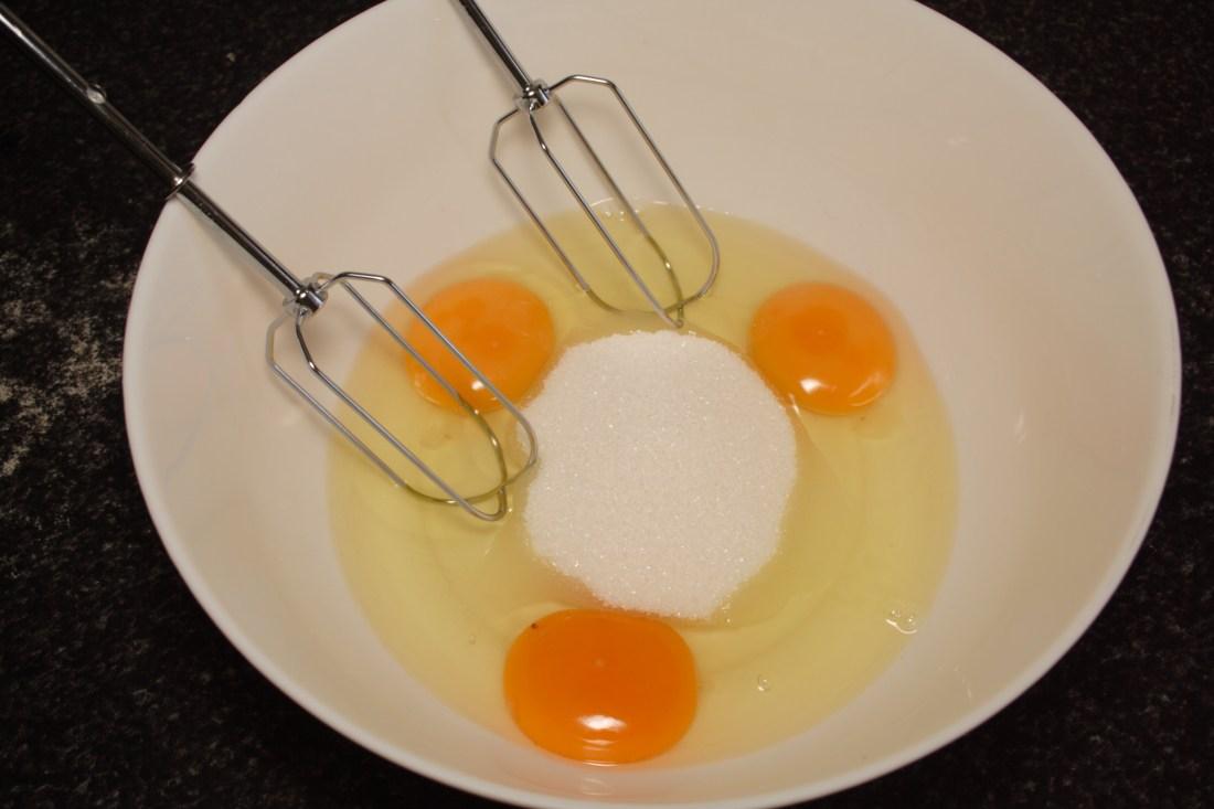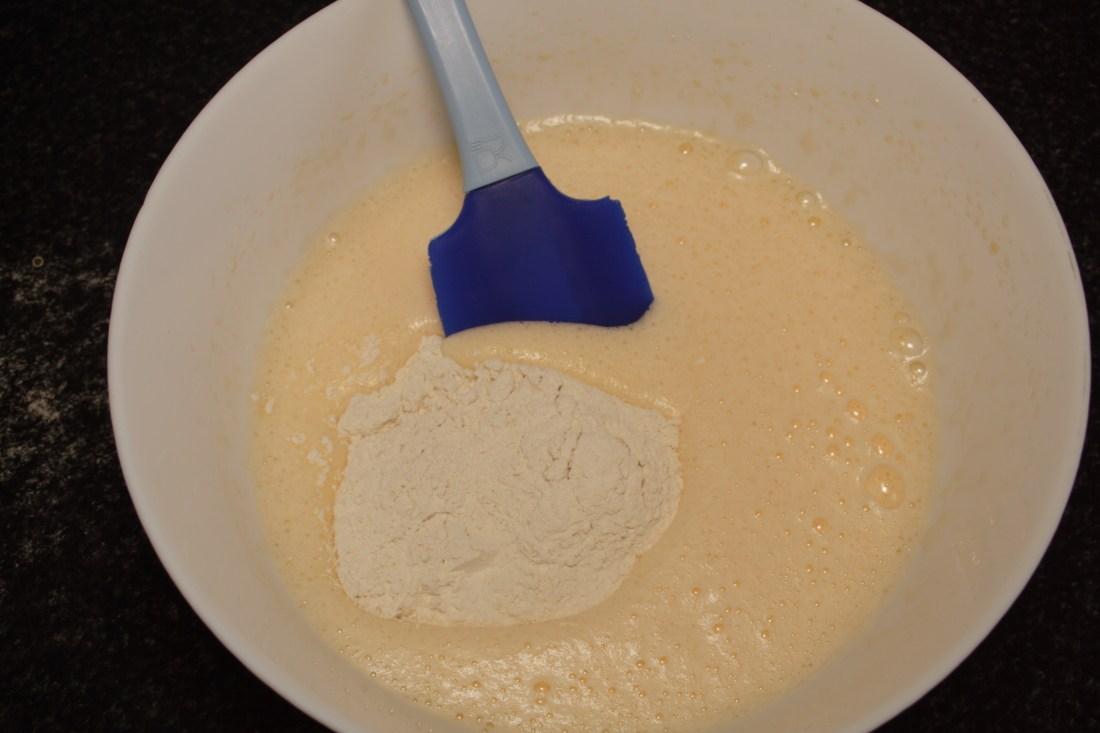 En otro bol ponemos los huevos y el azúcar, batimos bien con las varillas eléctricas, que aumente de tamaño y añadimos la harina, mezclamos suavemente y con movimientos envolventes, con ayuda de una lengua de repostería, hasta que quede todo incorporado, con aspecto de crema.