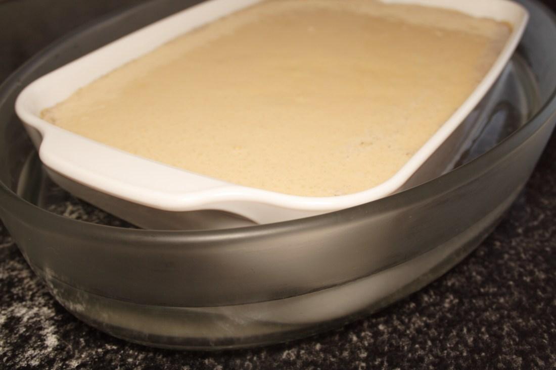 Como haremos nuestro bizco-flan al baño María, metemos nuestro molde en otro más grande con agua, sin llenar demasiado porque al hervir se nos puede inundar el postre.