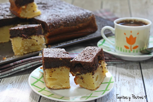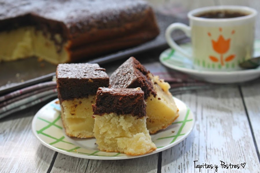 En esta línea se encuentra el postre de hoy, una mezcla de bizcocho y brownie que encontré en el blog The yellow kitchen y que quise probar para ver que tal quedaba. Y queda muy bien, un dulce para merendar y disfrutarlo porque es sencillo y fácil de hacer.