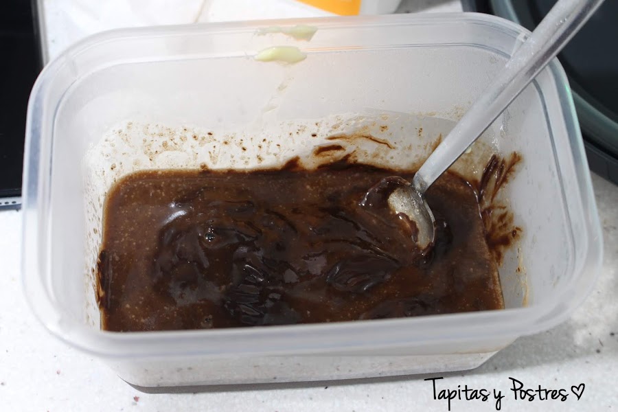 Fundimos el chocolate con la mantequilla en el microondas. Dejamos que se temple.