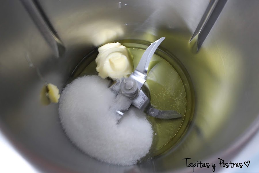 Ponemos la mantequilla, el aceite y el azúcar y batimos 1 minuto a velocidad 3 1/2. Podemos poner solo mantequilla, yo no tenia suficiente y puse mitad mantequilla mitad aceite.