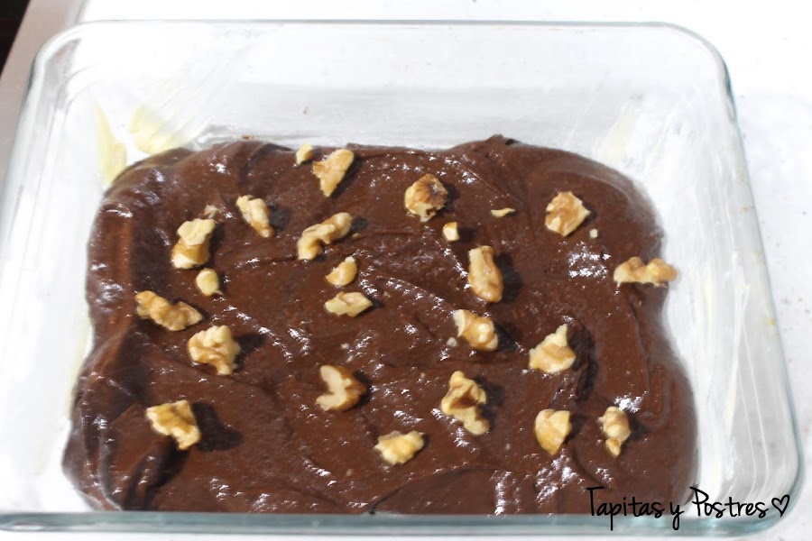 Vertemos la mezcla y añadimos las nueces. Al horno.