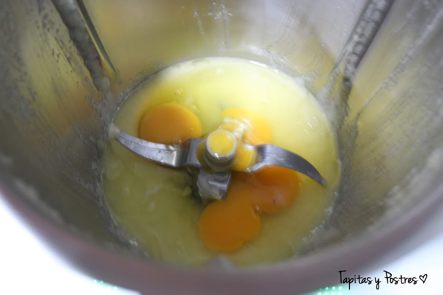 Lo ponemos en el vaso de la thermomix junto al huevo, la harina y el azúcar. Y mezclamos.