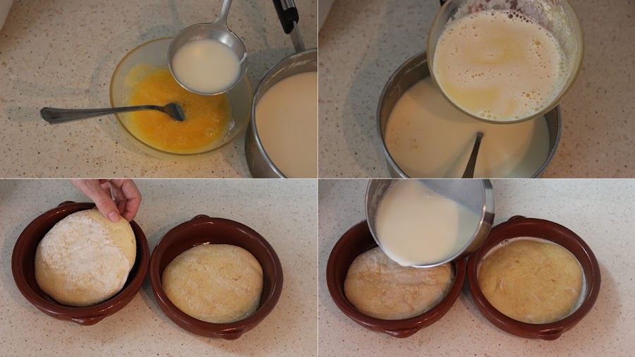 Colocamos una torta en cada plato, mejor que sea hondo, de sopa, y vertemos la leche sobre las tortas, repartida entre los cuatro platos.