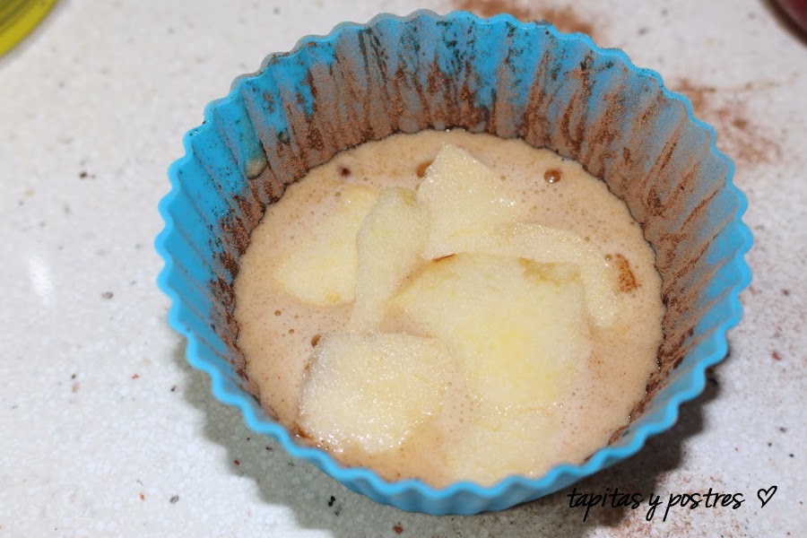 Vertemos la mezcla y si queremos añadimos algún ingrediente extra. Yo he puesto unos trocitos de manzana.