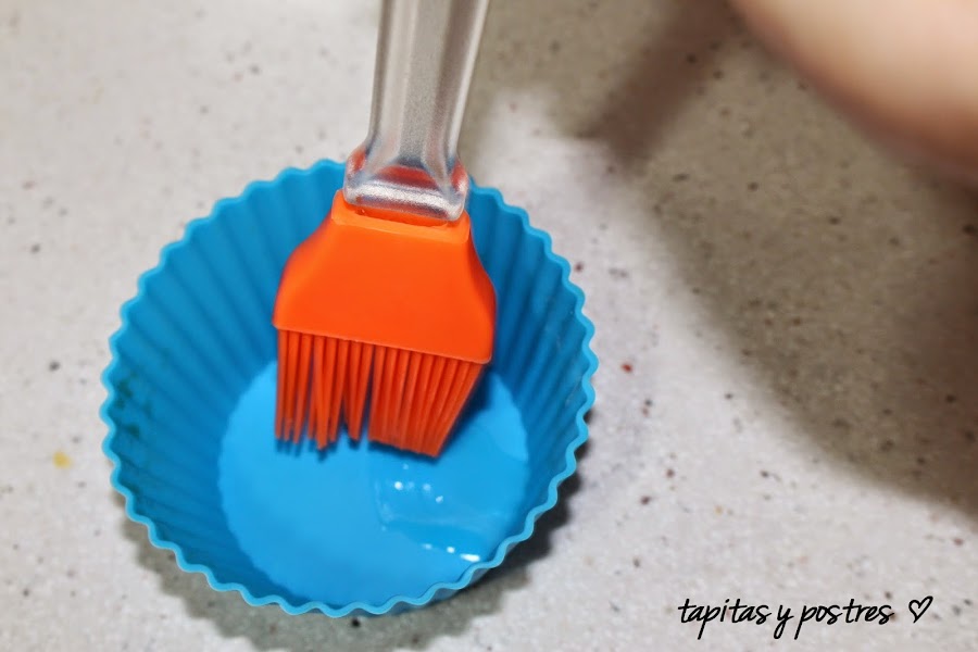 Pincelar con aceite el molde elegido (yo he usado unas capsulas de silicona tamaño XL) y espolvorear una pizca de cacao por todo el molde.