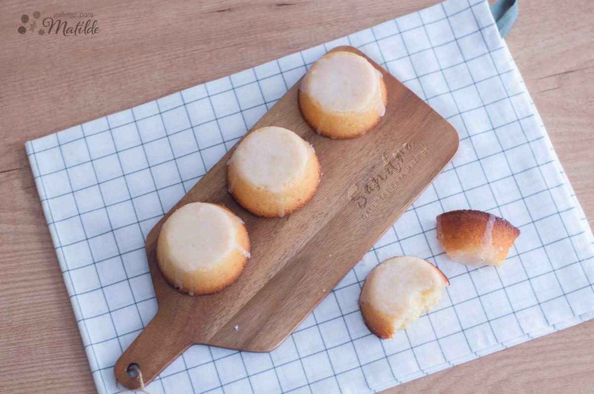 7.- Una vez que los bizcochos están fríos, elaboramos la glasa. Para ello, en un cuenco mezclamos 150g. de azúcar glas y 30-32 g. de zumo de limón. Mezclamos bien y cubrimos los bizcochitos con la mezcla. Tendremos la precaución de colocar los bizcochos sobre una rejilla para realizar esta operación, así la glasa que vaya resbalando por los bordes se irá eliminando sin quedarse amontonada en su base.
