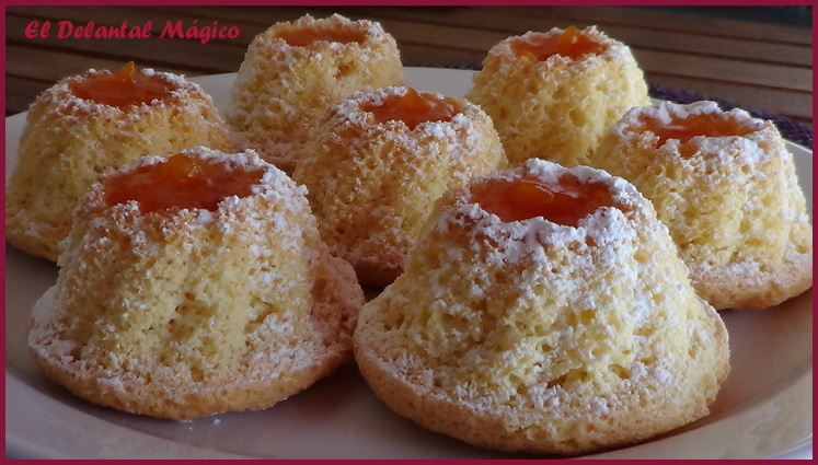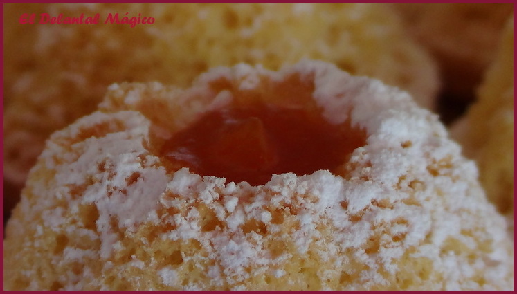 Añadimos la mezcla en nuestros moldes, y en el centro ponemos una cucharadita de mermelada. Introducimos en el horno durante 25-30 minutos.