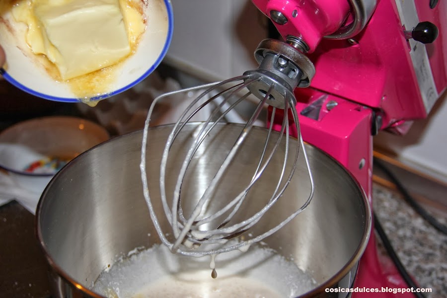 Comenzamos batiendo el huevo con el azúcar. Debe ser un batido largo para lograr que doble su volumen. cuando lo tengamos en este punto añadimos la mantequilla en punto de pomada y seguimos batiendo.