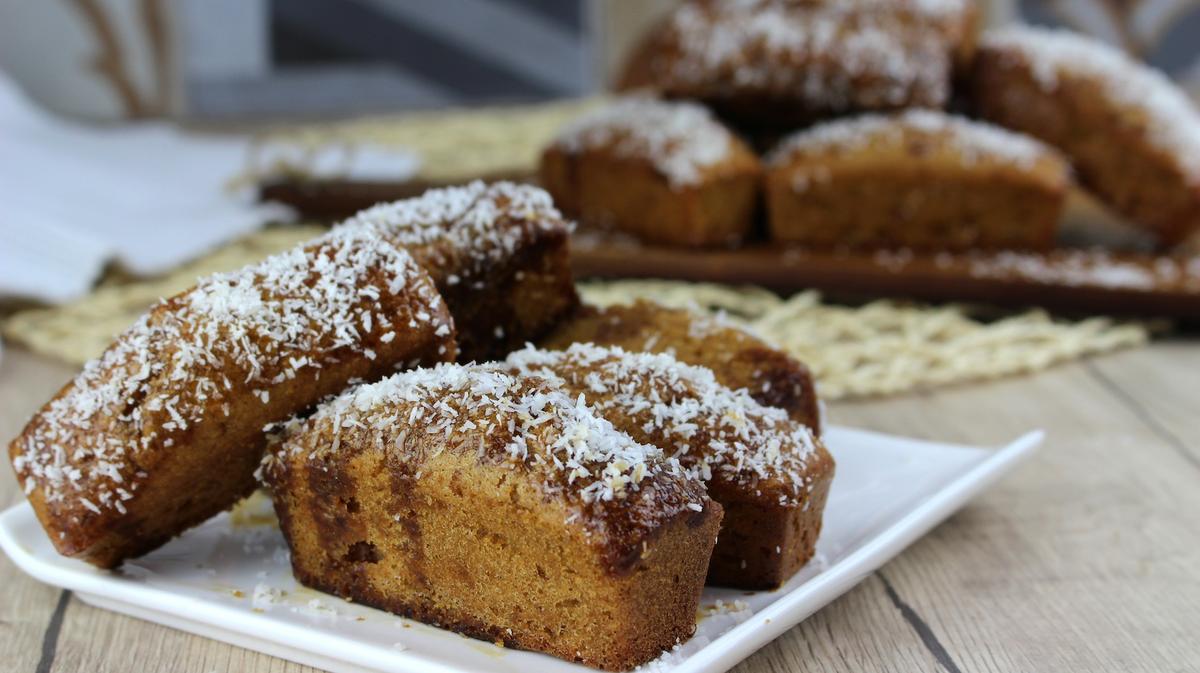Jugosos y tiernos bizcochos de coco en raciones individuales, calados con almíbar y coco rallado.