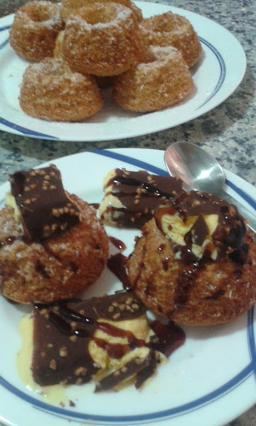 Se preparan unos moldes individuales engrasados y se vierte en ellos la masa. Se hornea unos 20 min. a 180 grados.