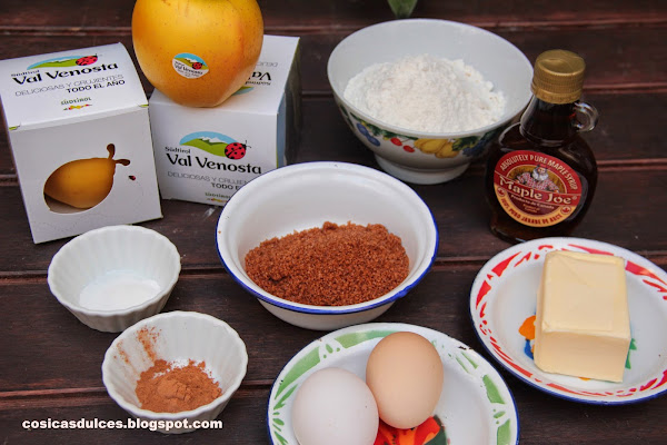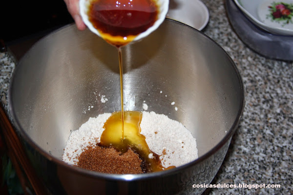 En un bol colocamos la harina, la canela y la levadura y mezclamos bien. Formamos un volcán y añadimos en el centro la mantequilla derretida, el azúcar moreno, el jarabe de arce y los huevos (no es necesario batirlos previamente).