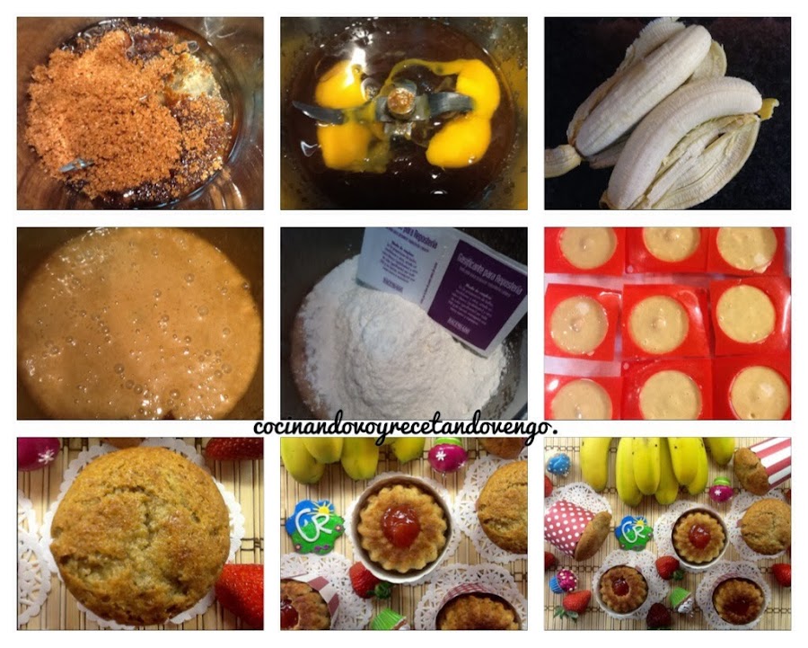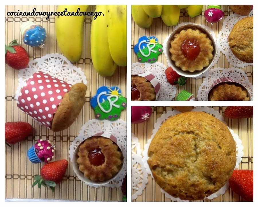Hola a tod@s!! hoy os traigo unos bizcochitos con sabor a plátano, que son una delicia, quedan tiernos, jugosos y con un sabor irresistible. En mi casa han sido muy bien recibidos...y como muestra decir que los he tenido que hacer en dos ocasiones!! Los vi en "UN ÁNGEL EN MI COCINA", un blog del que soy seguidora y os animo a que lo visiteis, Ra los acompañó de pepitas de chocolate y supe desde el primer instante que los devorarian...y así a sido. Con los moldes que he usado, queda un hueco ideal para rellenar, en la primera ocasión los rellené con chocolate fundido y en esta que os traigo hoy están rellenos con mermelada de fresa, decir que ambos sabores combinan fenomenal con el plátano, aunque solos también están de 10.