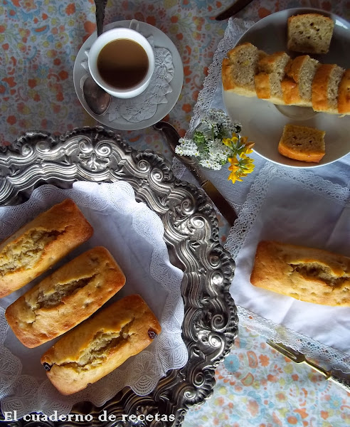 El resultado es un riquísimo y estupendo bizcocho húmedo, con un suave sabor a plátano y al que yo además añadí pasas y nueces partidas porque me pareció que combinaban bien.