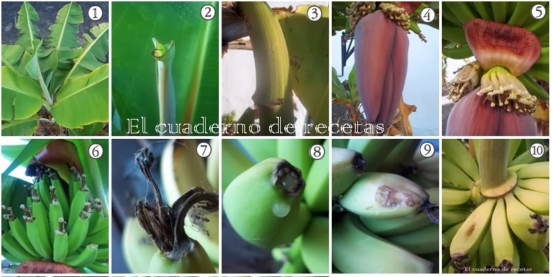 De ese tallo brotará una especie de flor rojiza, que albergará a todos los futuros plátanos. Irá enrollando sus hojas hacia arriba e irán apareciendo los pequeños frutos, que poco a poco irán creciendo y engordando. Cada hoja que se desliza, es una nueva capa de plátanos, a la que se le llama manilla.