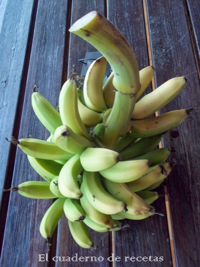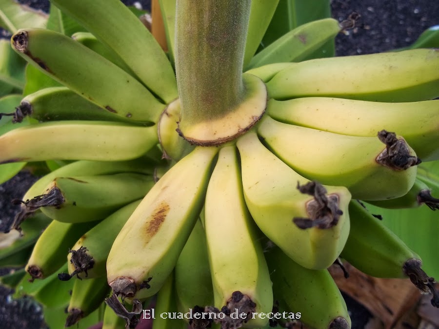 Aquí os presento una pequeña piña de plátanos, como véis no tiene muchas manillas, es una platanera pequeña y las piñas van acorde al tamaño. El sabor es dulce y muy jugoso, pero eso ya lo sabéis.