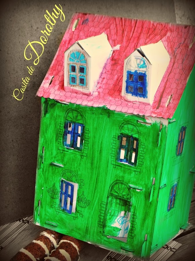 La casa............ay la casa jajaja, por supuesto pintada por mi nena (con ayuda de papi). La teníamos ya en casa. Es la casita que utilizamos para jugar con las figuras de peppa pig. Es una casita de cartón de las que se montan y que hay que pintar. Y bueno, así de mona le quedó.