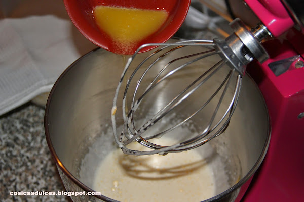 Batimos los huevos junto al azúcar. Cuando estén bien espumosos añadimos la mantequilla que previamente habremos derretido y dejado entibiar, la leche y las ralladuras.