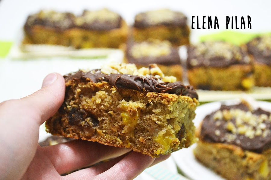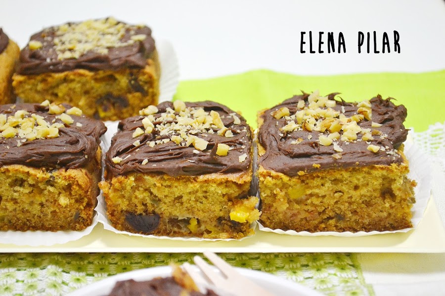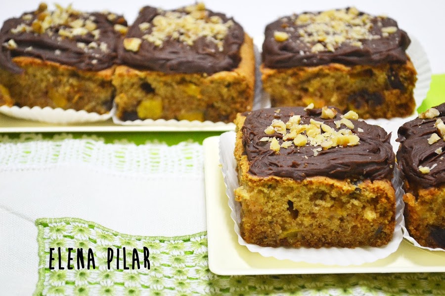 Para acabar, añadimos los dátiles y los trocitos de melocotón, y removemos lo justo para que se repartan por la masa. Una vez horneado, lo dejamos enfriar por completo antes de desmoldar. A continuación, lo sacamos del molde y lo cortamos en porciones. Yo lo dividí en nueve bizcochos un poco grandotes. Y ahora, con el bizcocho divido, elaboramos la cobertura.