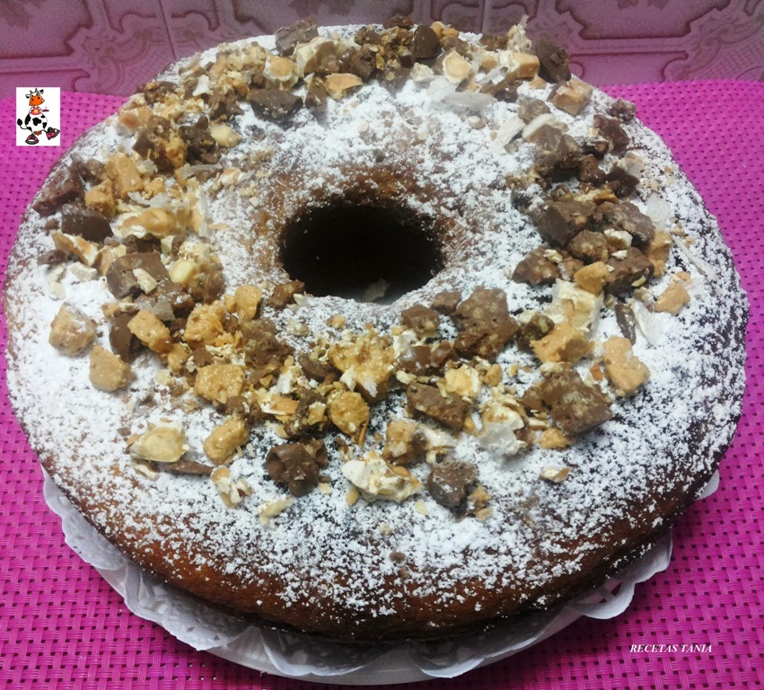 harina, vamos batiendo hasta tener una masa ni muy espesa ni muy liquida.Troceamos pequeñito los 3 turrones y lo añadimos en la masa y mezclamos todo bien. Untamos de mantequilla el molde que vayamos a usar para hacer el bizcocho y espolvoreamos de harina,lo metemos todo en el molde. Metemos el molde en el horno a 200º durante 45 minutos,pasado este tiempo metemos un palillo en la masa y si sale limpio es que está terminado.