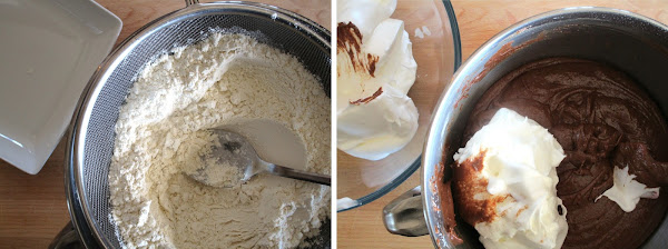 Con una lengua y movimientos envolventes, añadimos la mezcla de chocolate a las yemas montadas. Después tamizamos la harina, junto con la sal y el bicarbonato, y los incorporamos a la mezcla. Terminamos de formar la masa del bizcocho agregando las claras en 2-3 veces. Rellenamos el molde encamisado, alisamos la superficie y lo horneamos durante unos 40 minutos o hasta que al pincharlo con un palillo, éste, salga limpio.