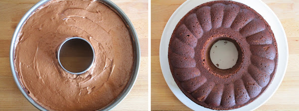 Preparamos todos los ingredientes para que se atemperen a la temperatura ambiente. Precalentamos el horno a 180 ºC, con el calor arriba y abajo y la bandeja un poco por debajo de la mitad del horno. Encamisamos generosamente un molde de aro de unos 26 cm de diámetro, o similar, con mantequilla y cacao en polvo. Si usas un molde que no sea de aro, sólo tendrás que tener más tiempo el bizcocho en el horno.