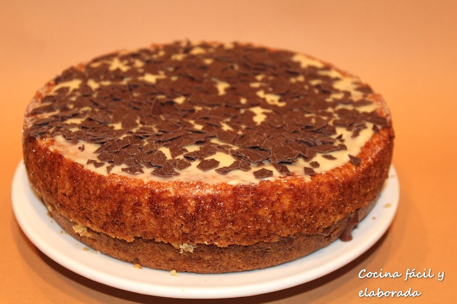 Terminamos montando el bizcocho, vertemos la crema de chocolate en la mitad del bizcocho, lo tapamos con la otra mitad, cubrimos con la crema de chocolate blanco y por último espolvoreamos con el chocolate negro.