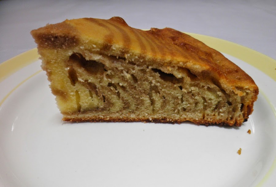 Para que se haga la forma de cebra del bizcocho: echar 3 cucharadas de masa sin chocolate en el medio del molde, seguidamente 2 cucharadas de la masa de chocolate encima de la otra, continuamos con 3 cucharadas de la de sin chocolate, 2 cucharadas de la de chocolate y así alternativamente hasta terminar con las masas. (Iréis viendo como se van expandiendo poco a poco hacia los bordes del molde pero con el orden que llevan).