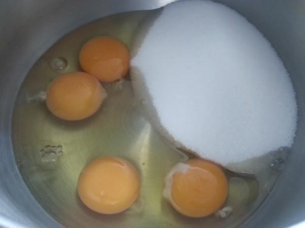 1. - Encendemos el horno a 170º. Y vamos batiendo los huevos con el azúcar hasta que quede cremoso y doblen el volumen.